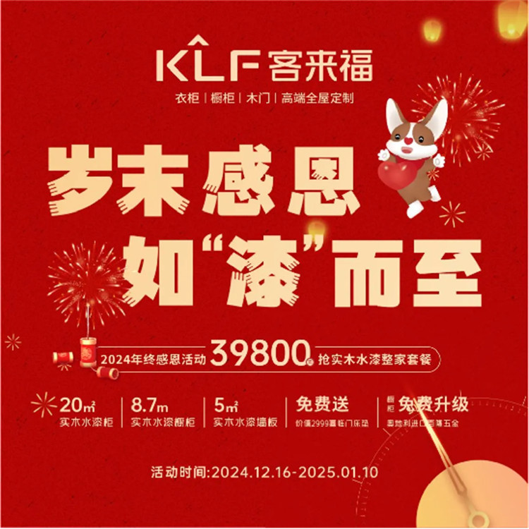 實(shí)木水漆,整家煥新。即日起至2025年1月10日,客來(lái)福家居聯(lián)動(dòng)全國(guó)百城千家門(mén)店,共同開(kāi)啟“2024年終感恩”全民狂歡活動(dòng),為家居品質(zhì)升級(jí),環(huán)保升級(jí),舒適升級(jí)。