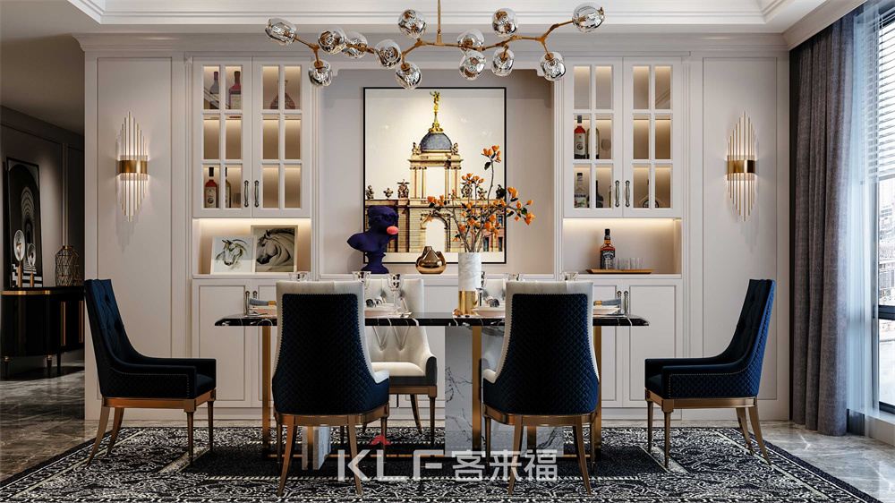 餐廳設(shè)置在客廳旁邊,同時(shí)靠近廚房,動(dòng)線合理,陽臺(tái)光線的射入,也保證用餐時(shí)充足的光源。餐邊柜既保障了合理的收納需求,又滿足藏酒人的喜好。典雅藍(lán)+素雅白+華貴金包裹的餐桌椅,搭配大理石風(fēng)格的典雅餐桌,美食每刻縱享奢華。