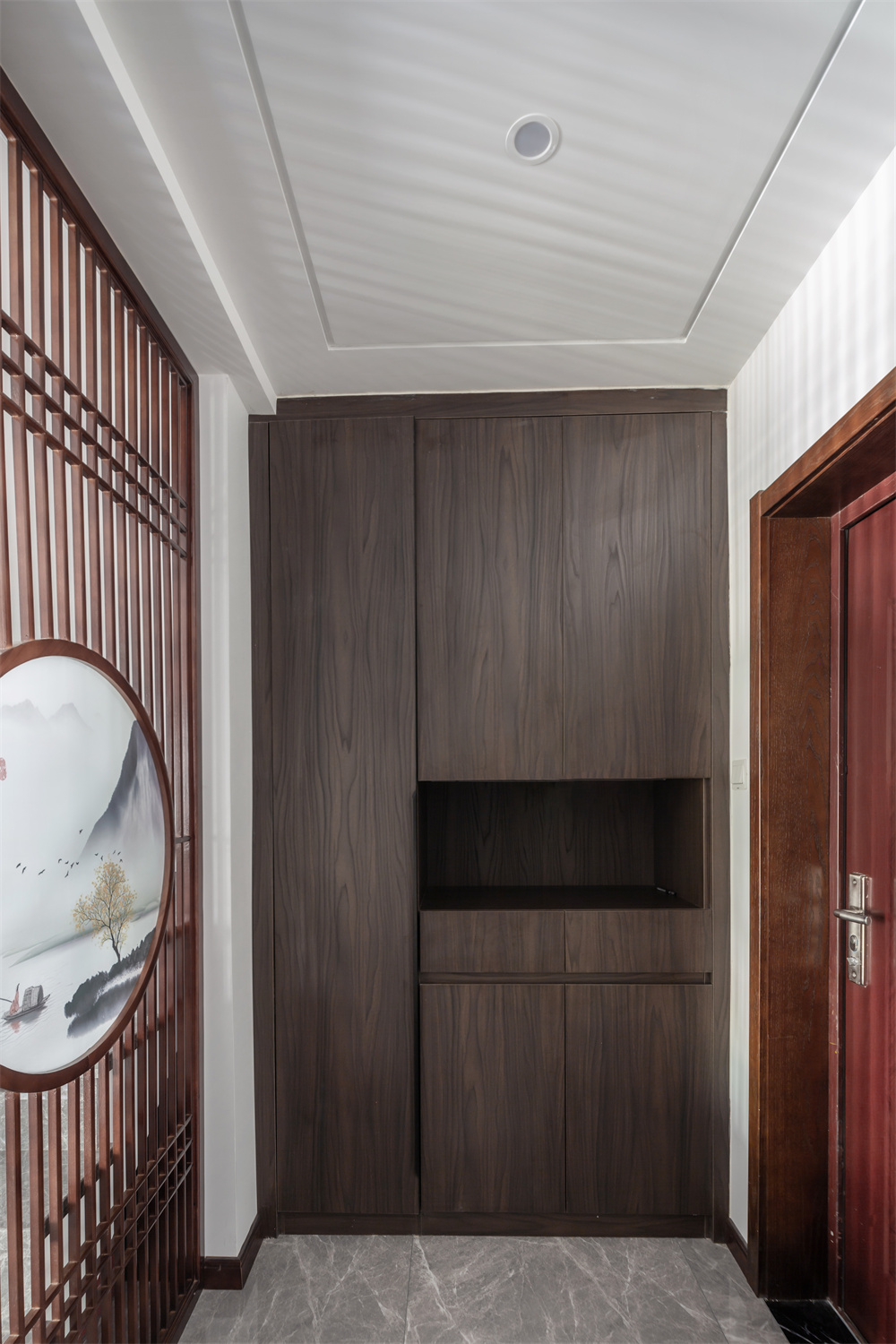 進門處便是整面到頂?shù)囊鹿?,可以省去柜頂打掃的煩惱。玄關柜在右側柜體中間做了鏤空設計,便于日常放置鑰匙、快遞等小物件。