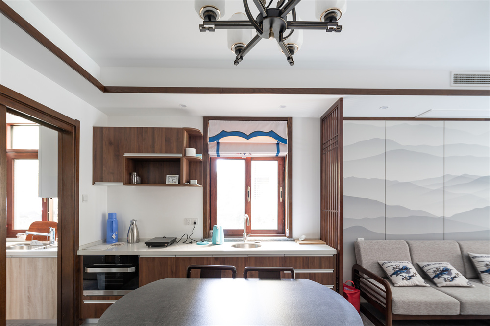 餐廳處沒有多余的修飾,前方定制了整體的餐邊柜,安裝了洗手池、轉角柜等設計,方便在吃飯后清洗手。窗戶上面采用拉伸式窗簾的設計,在吃飯時便可看見窗外的景色。轉角柜的設計便于放置一些熱水壺、碗筷、抽紙等日常物品,在吃完飯便可拿取抽紙來擦拭。