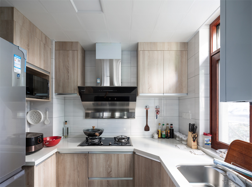 廚房:整體采用了U型的空間設計頂部木色柜體的設計,充分利用油煙機兩旁的空間,便于放置一些家用電器、餐盤、榨汁機等物品。