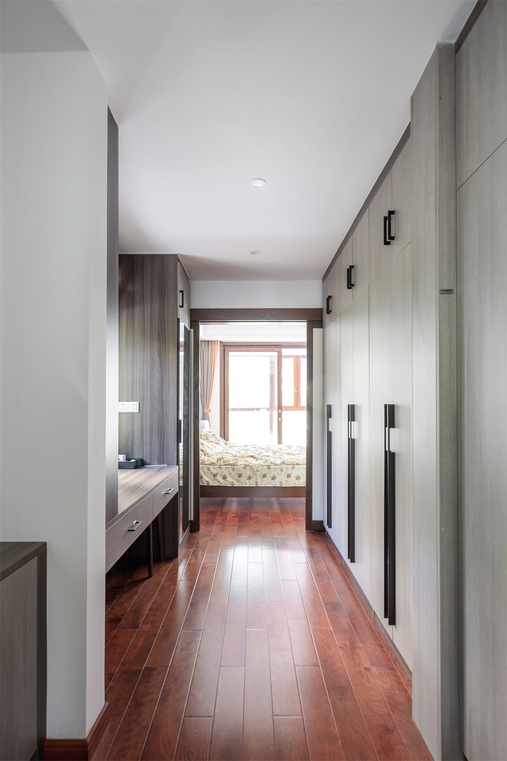 走廊雖然與主臥相連接,但是臥室處中間采用推拉門的設計,關上就是兩個各自獨立的空間。走廊處整面到頂?shù)囊鹿?,可以當做整體的衣帽間來使用,收納衣物的能力很強。