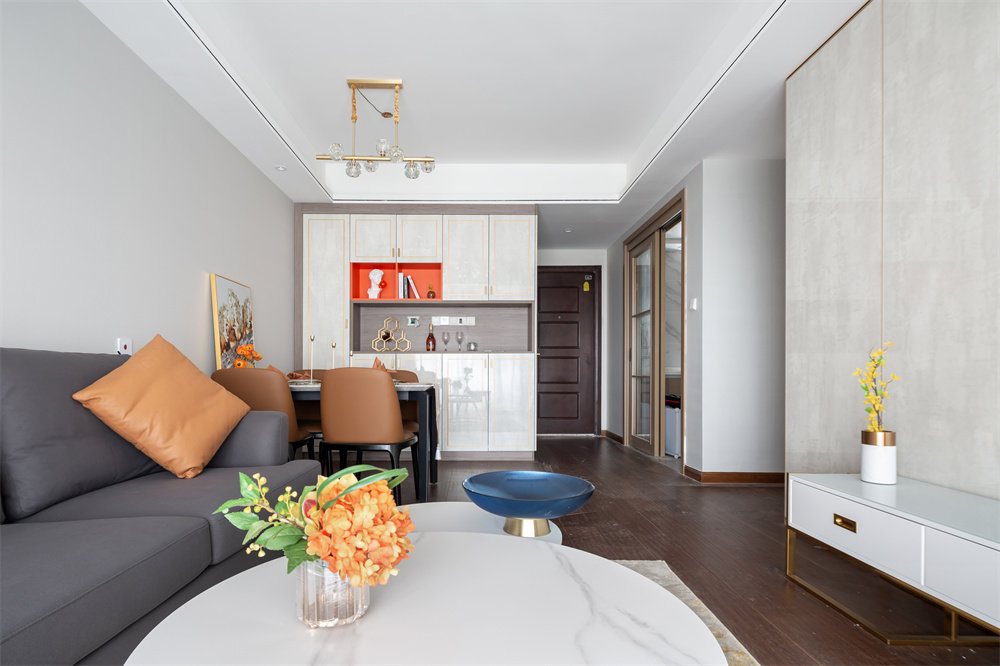 餐廳處的風(fēng)格秉承了輕奢風(fēng)格的特點(diǎn),設(shè)計(jì)師采用橘色、金色、芬藍(lán)構(gòu)成了餐廳的主色調(diào)。正面到頂?shù)牟瓦吂衽c墻面無縫銜接,通過餐邊柜上的擺件便可看出屋主的品味。裝飾物的點(diǎn)綴讓餐邊柜獨(dú)具魅力,金屬酒瓶的架子,對于日常喜歡小酌一口的家庭來說十分合適,如果再安裝酒柜的話空間不夠,餐邊柜的功能相比酒柜更加實(shí)用。