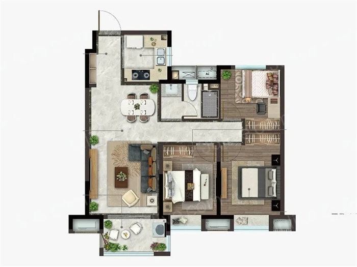 本次戶型屬于三室兩廳的構(gòu)造,從玄關(guān)處進(jìn)入便是客廳和餐廳,廚房位于餐廳的一側(cè)。往里走去便是走廊,走廊兩側(cè)分布著臥室和衛(wèi)生間,整體構(gòu)造清晰,格局分布透徹。