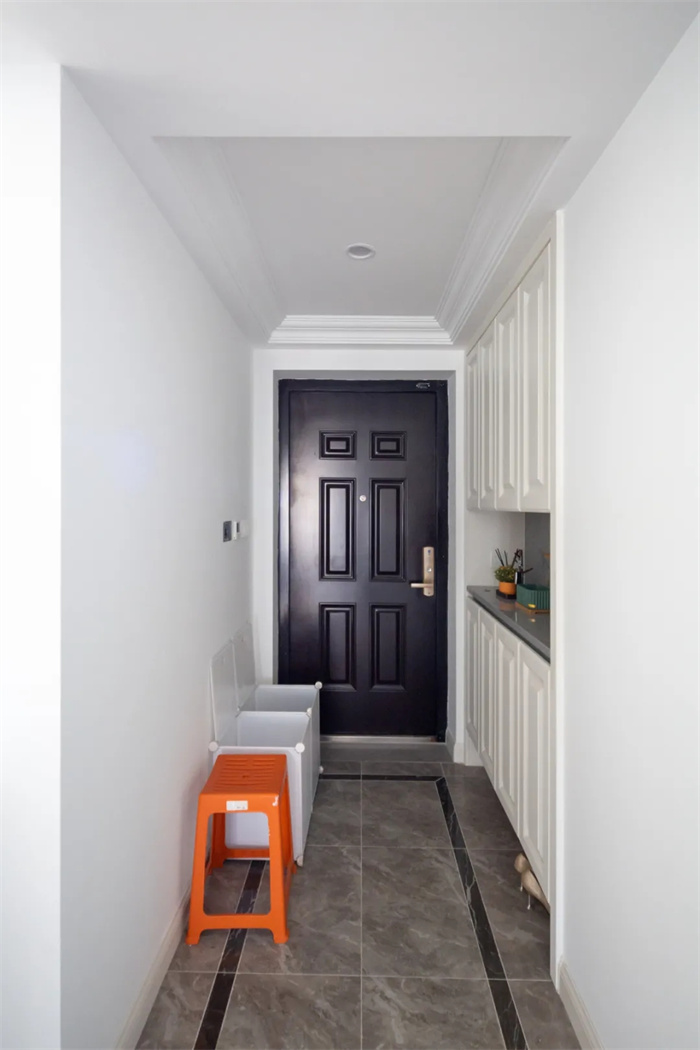 打開(kāi)家門(mén)玄關(guān)是第一眼便能看到的,嵌入式玄關(guān)平行于墻面,十分平整不占據(jù)額外的空間。玄關(guān)整體是芬蘭白的墻面,玄關(guān)柜們使用膜壓門(mén)板,打磨的深度和形狀流暢。戶主在上方放了一些雜物,中間做了鏤空臺(tái)面,平時(shí)放鑰匙扣、快遞、雨傘都很方便。下雨平常出門(mén)著急,將鞋子放進(jìn)下方空間中,省心又不會(huì)讓家里看起來(lái)太亂。