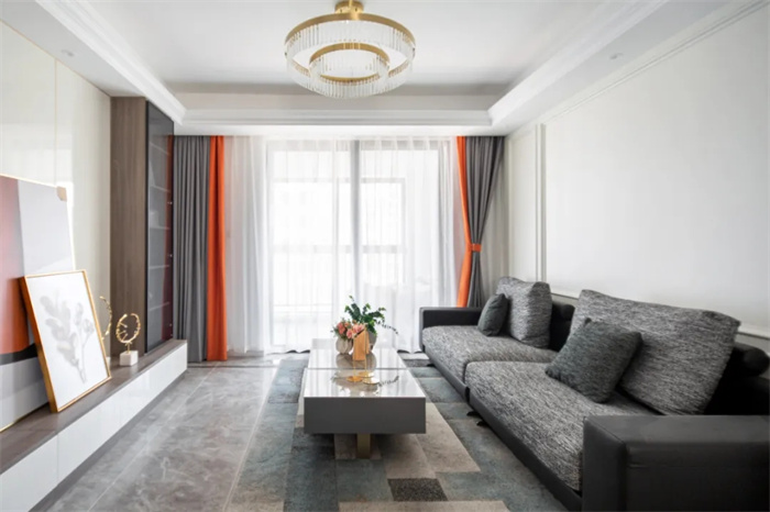 灰色皮質(zhì)沙發(fā)一眼望去便能感受柔軟的觸感,白色的茶幾下方鋪上地毯,給輕奢增加一絲不尋常的味道,冬天可以把地毯抽出去孩子在上面玩耍,但是記得要及時(shí)打理。