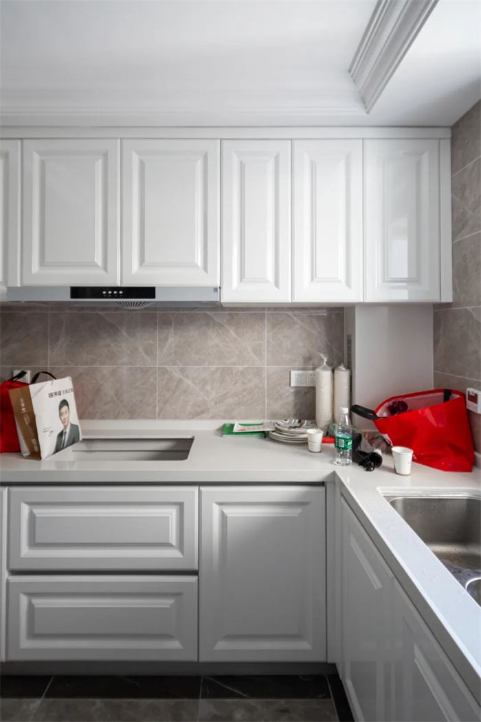 芬蘭白膜壓門(mén)板搭配大理石紋路的瓷磚,空間干凈又簡(jiǎn)潔。廚房空間為典型的L字型設(shè)計(jì),從做飯到洗碗家居動(dòng)線流暢清晰。