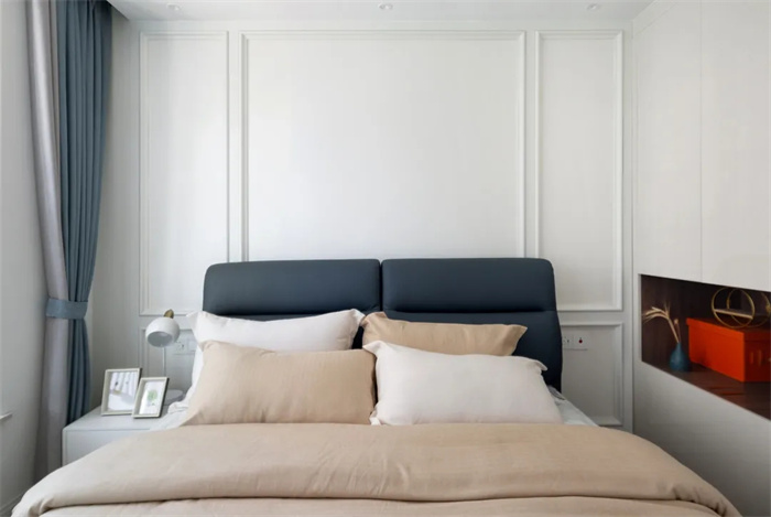 臥室采用膜壓板背景墻,石膏線給背景墻增加層次感。飄窗處安置了護(hù)欄,為孩子的安全保駕護(hù)航。整面的衣柜處在左側(cè)做了鏤空,給白色增加點(diǎn)質(zhì)感,顯得小巧又實(shí)用。
