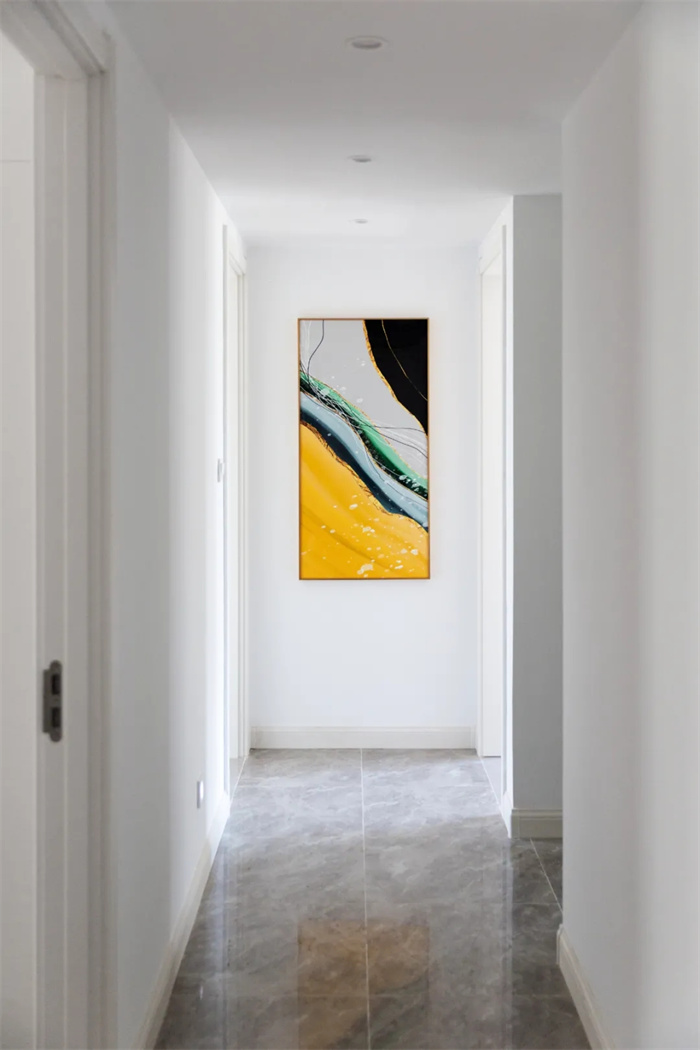 走廊起到連接和貫通的作用,兩側(cè)分布著臥室和兒童房,墻上如沙灘海浪的掛畫(huà),給人清新的感受。