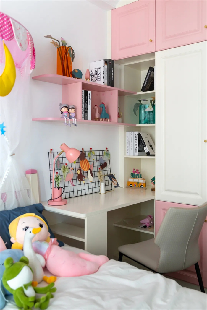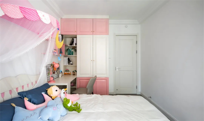 由于戶主家有個(gè)小女孩,所以在顏色搭配上選擇了粉粉嫩嫩的粉色,與白色中和,整體十分柔和,仿佛掉進(jìn)糖果蜜罐里。床上放置了一些娃娃,也是非常用心了。