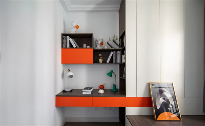 此間臥室的床鋪采用榻榻米的設(shè)計(jì),床上方可以自如掀開(kāi)儲(chǔ)放雜物。整體空間選用最亮眼的橘色搭配不沖突的橡木紋,在視覺(jué)上給人以沖擊感。書(shū)桌上方安置吊柜,留出一段距離不至于顯得擁擠。