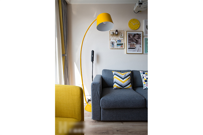 進入客廳,首先映入眼簾是簡約的白色立柜和一組照片墻的設(shè)計。每一張照片仿佛都在述說一個故事,記錄這個95后小夫妻每個難忘的瞬間??蛠砀6ㄖ频姆姨m白入戶柜和木門在照片墻的陪襯下溫馨感十足。撞色的沙發(fā),簡潔明快的亮黃色搭配深灰色立體感拉滿,駝色墻面上的藝術(shù)畫交錯搭配,透露著一絲文藝氣息。