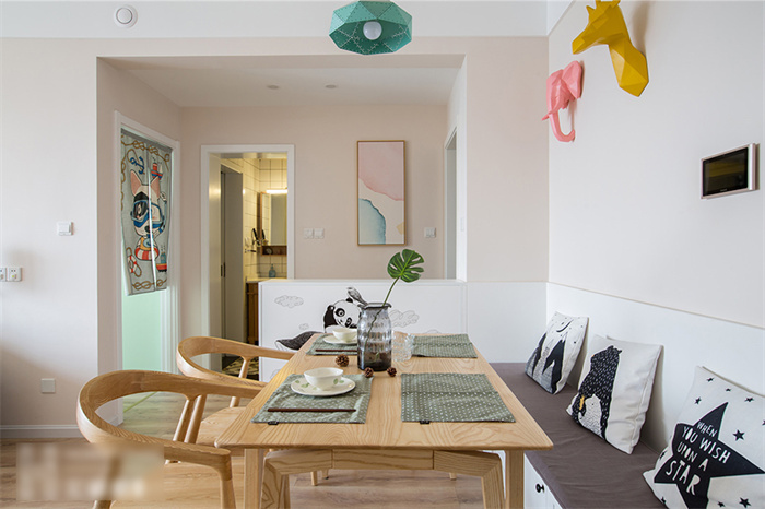 餐廳除了滿足正常用餐的需求之外,還增加了收納功能。為此客來福在餐廳處專門定制了一排繞墻的沙發(fā)柜,這樣家里就算多幾個人來就餐,也不會顯得擁擠。原木色的餐桌與馬卡龍色系的吊燈平衡出北歐精致。餐廳墻面上,三種動物的掛件與同色系吊燈在鮮明的顏色中演繹著北歐風(fēng)情。
