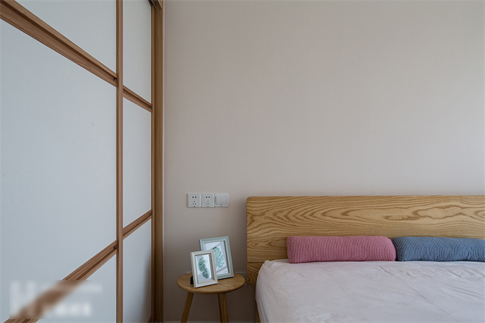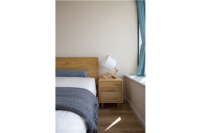 主臥的設(shè)計從實用性出發(fā),白色的衣柜和墻面形成一體,顯得生氣十足;在床頭柜的選擇上也是遵從屋主追求自然的理念,原木床體,搭配設(shè)計感十足的幾何造型床頭燈,渲染出濃濃的自然氣息。湖藍(lán)色的飄窗無不在表達簡約、舒適的生活主題。“當(dāng)清晨的第一縷陽光透過窗簾的縫隙擠進來,余生,我想把日子過成自己想要的模樣?!?/span>