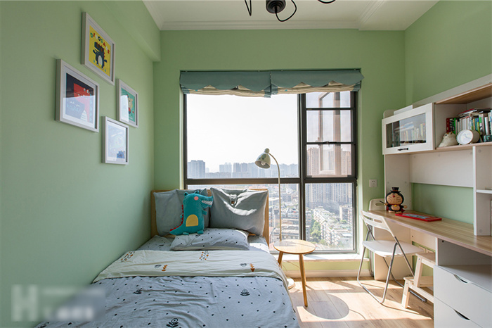 兒童房以綠色為背景,搭配白色吊燈和立柜,活潑中還有一絲可愛。墻上的兒童簡筆畫、兒童家具、卡通玩偶,營造了一個夢幻、童真、舒適、富有想象力的空間。