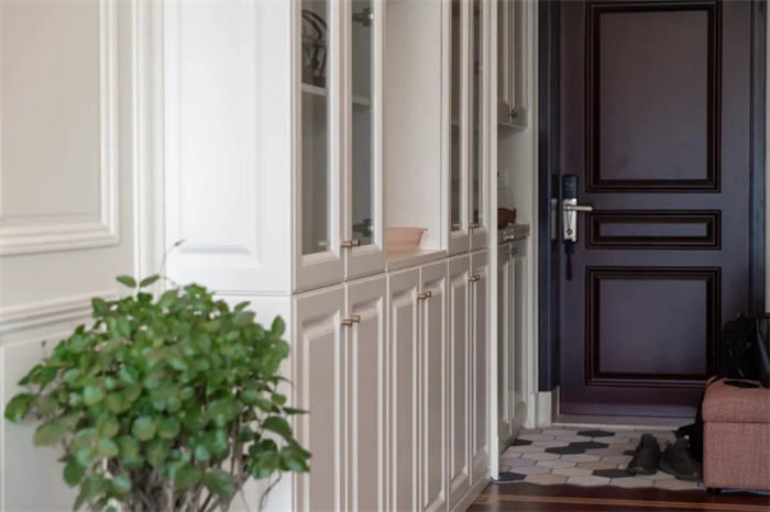 在進(jìn)門處打造了整面到頂?shù)男P(guān)柜,門的右側(cè)放置小巧的換鞋凳。芬蘭白的玄關(guān)柜搭配膜壓門板,展現(xiàn)出門板做工的精細(xì)和準(zhǔn)確。金色的立體把手適應(yīng)人體美學(xué)需求,在柜門關(guān)上時(shí)做了緩沖的設(shè)計(jì),緩緩關(guān)上可減少噪音。中間鏤空部分安置了三到四個(gè)插座,給手機(jī)充電或者安上小夜燈,都是很方便的。