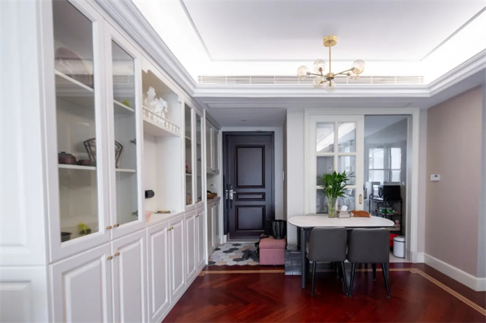 左側(cè)便是與玄關(guān)柜相連的餐邊柜,餐邊柜集酒柜、收納柜的功能于一體,最大限度發(fā)揮出產(chǎn)品的使用價(jià)值。芬蘭白的門板顏色與透亮的玻璃相搭配,不需要額外給物品增加神秘感,想要的東西拉開柜門便可以拿到。餐邊柜中間部分上方的圍欄設(shè)計(jì),放置石膏雕像增加空間內(nèi)的藝術(shù)感。