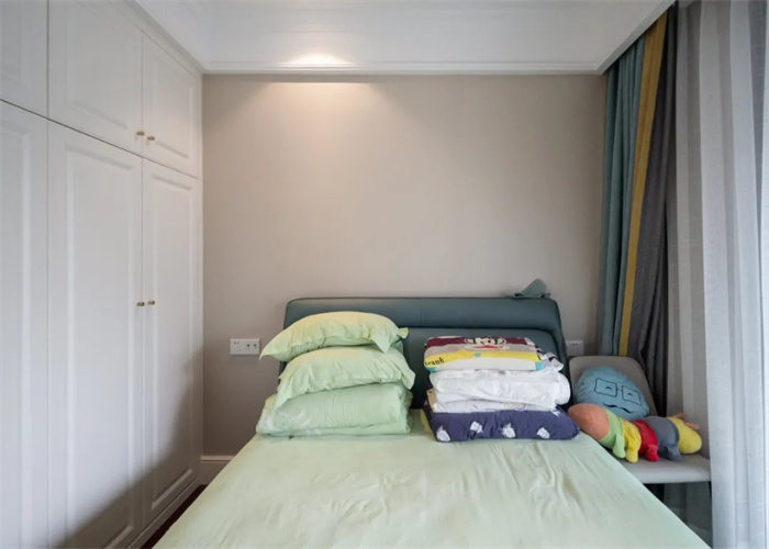 次臥與陽臺(tái)相連接,使得整體的光線更加透亮,實(shí)現(xiàn)了在早晨起來便能感受到來自外界的第一縷光亮。與主臥處顏色搭配相反,床鋪使用的是相應(yīng)的淡綠色,背景墻采用的是棕色。
