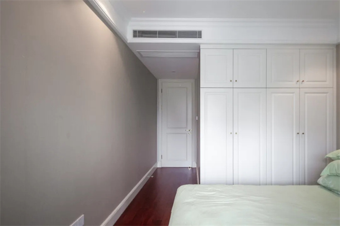 一側(cè)整面到頂?shù)囊鹿?,兩開門的衣柜設(shè)計(jì),精美的膜壓門板花紋,給空間增添一絲層次感。金色的立體把手減少了拉開門時(shí)的阻力。在打造的時(shí)候要注意衣柜與床鋪之間的距離,避免拉開的時(shí)候與床邊相碰撞。