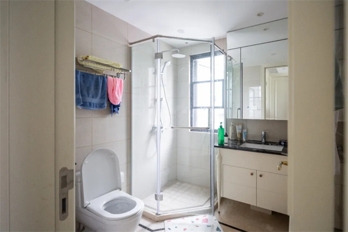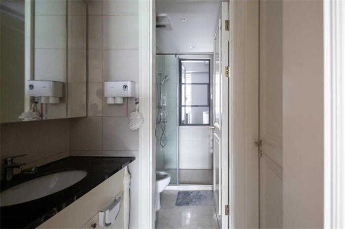 此處衛(wèi)浴間位于書房和儲(chǔ)物間的中間,透光性略微有些不充足。從衛(wèi)浴柜到馬桶到淋浴間三者按照順序有序打造, 使用起來相對方便。