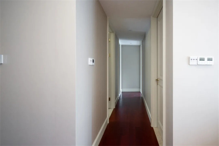走廊中間空間相對較窄,在走廊盡頭為主臥和儲(chǔ)物間,若想要增加空間內(nèi)的豐富性,可以在走廊盡頭加上一幅掛畫,使色彩更為豐富。