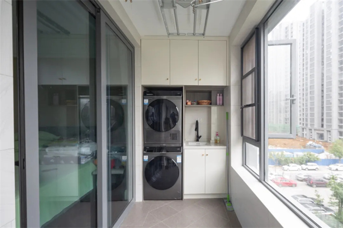 通過陽臺(tái)可以看見窗外郁郁蔥蔥的樹木,小區(qū)的居住環(huán)境優(yōu)美,安靜宜人。陽臺(tái)呈現(xiàn)狹長的形狀,一側(cè)為洗衣機(jī)柜,根據(jù)兩個(gè)洗衣機(jī)的高度比例進(jìn)行打造,上方較高的柜體放置一些洗滌用的雜物,下方放一些衣架便于拿取。洗衣機(jī)柜與餐邊柜為同樣的門板顏色和把手形狀,打造起來比較省心。