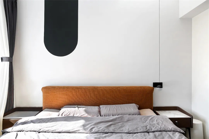 臥室大面積白色打底,愛馬仕橙的床頭套和灰色的被褥,白色+灰色+愛馬仕橙的顏色搭配彰顯精簡主義的真諦。
