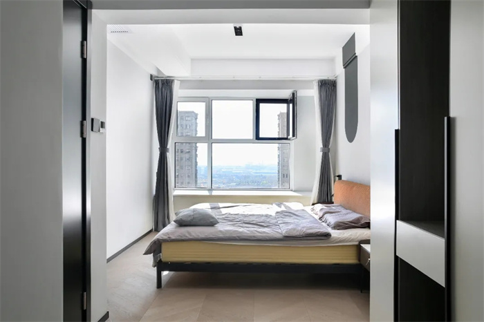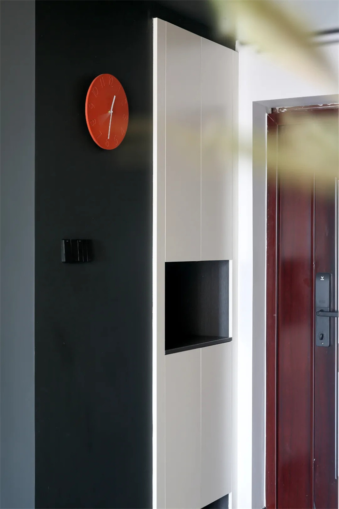 4.室內(nèi)柜體均采用芬蘭白+黑色把手的樣式,簡約百搭。芬蘭白和灰橡木的柜子與極簡主義所要求的色彩相呼應,整面到頂?shù)墓褡釉黾恿耸占{的空間,滿足兩人生活的收納需要。