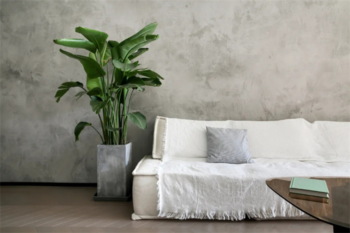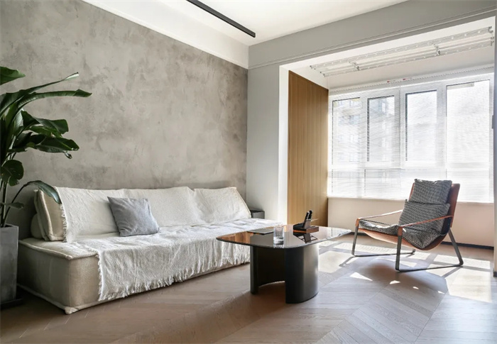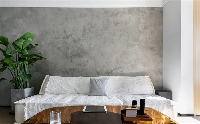 類似于侘寂風的水泥風格背景墻,斑駁的灰色紋路給人穩(wěn)定情緒的作用,背景墻采用的是仿真水泥墻面的墻布,比較實用且可以降低裝修成本,觸感柔軟。沙發(fā)上蓋了一條白色流蘇沙發(fā)布,以卡其色沙發(fā)套打底,整體顯得十分柔和。魚骨紋的拼接地板承襲了空間一貫的簡約風格,偌大的立體綠植給增添一抹生機。