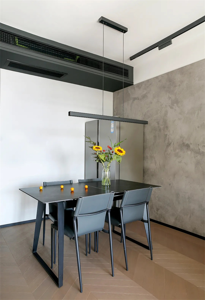 水泥灰的餐桌透露出滿滿的工業(yè)風設計,桌上擺放新鮮的花束,業(yè)主時不時會購買新鮮的花束擺放在餐桌上,展現(xiàn)出對美好生活的精準向往。