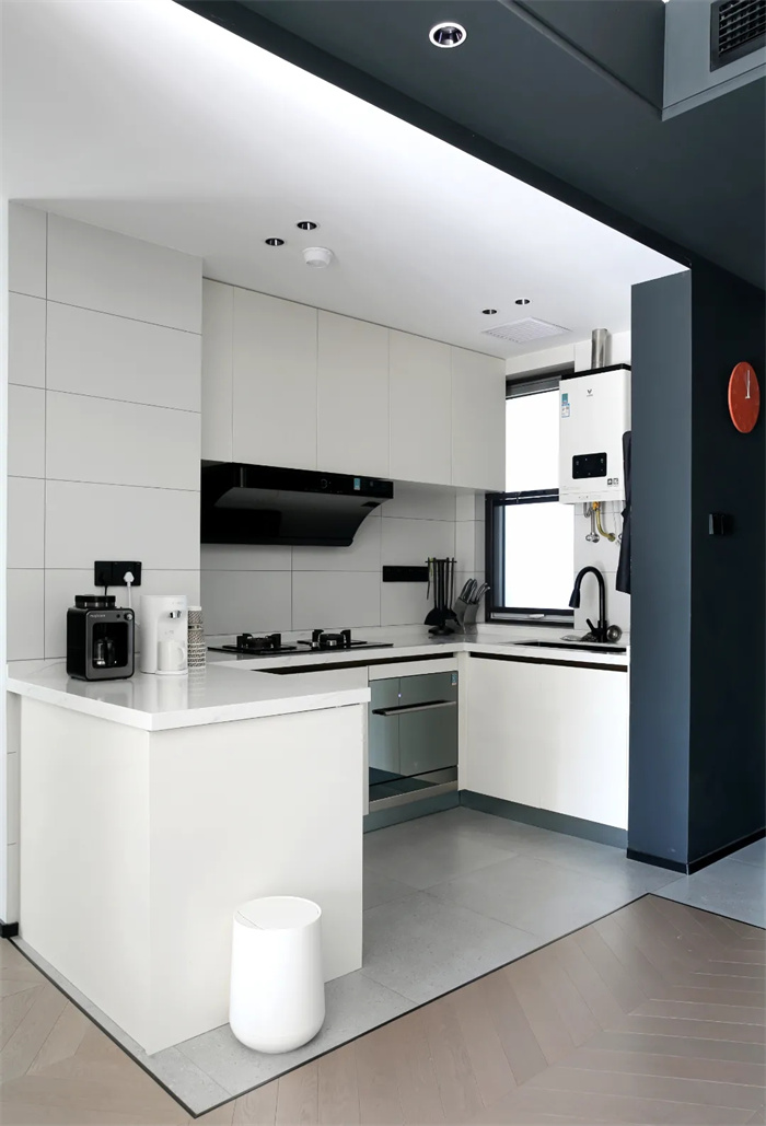 廚房在進門的右側(cè)打造出了U字型的空間布局,類似于公寓性質(zhì)的開放性廚房,在玄關延伸出一部分墻體,在廚房格局的左側(cè)延伸一部分可以作為島臺使用,形成完整的廚房空間。