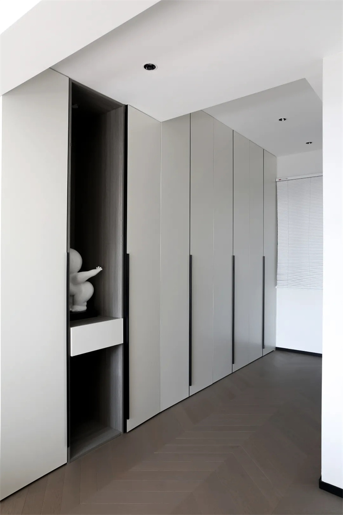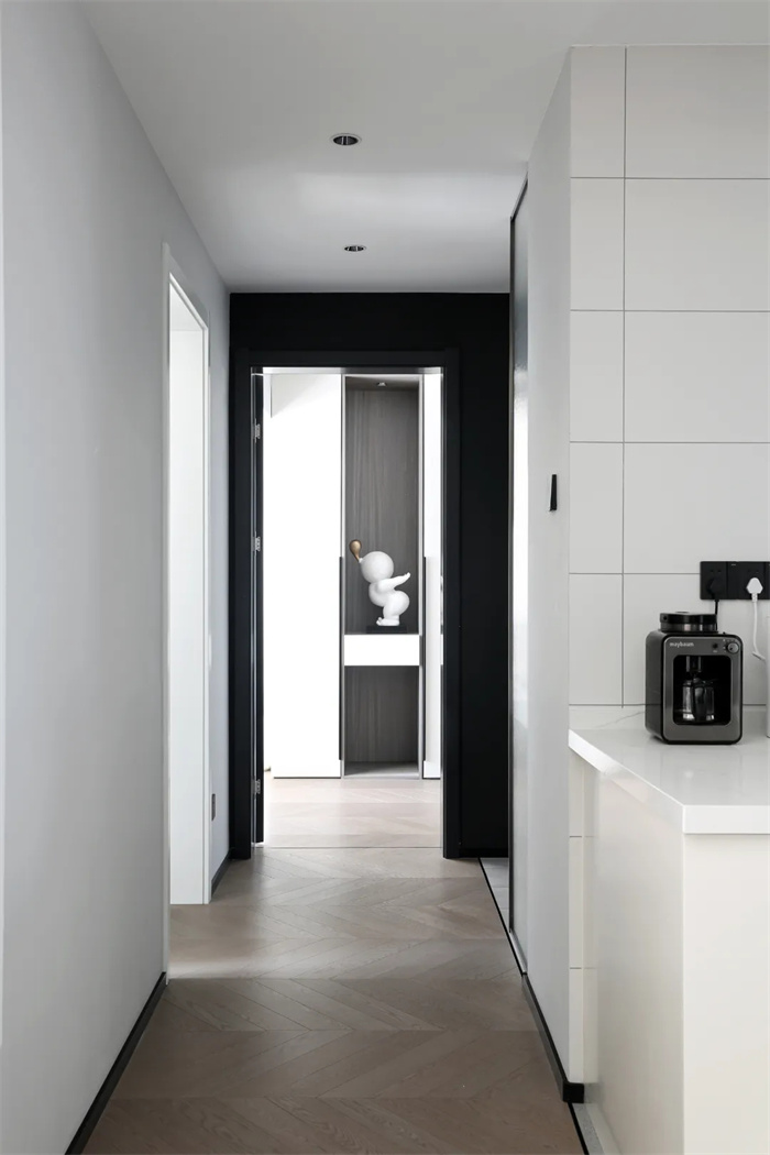 走廊空間可容納兩人并排過,映入眼簾的便是拼接的魚骨紋地板,規(guī)律的拼接產(chǎn)生一種美感。直對著臥室內(nèi)的裝飾擺件,生動且有趣。