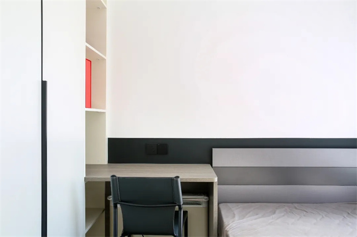 次臥同樣是采用整面到頂?shù)囊鹿瘢钆浜谏拈L條把手,靠墻的一側(cè)打造成開放收納格的設計,延伸的桌面下方放了暖風機等設備,次臥格局雖不大,勝在簡約。