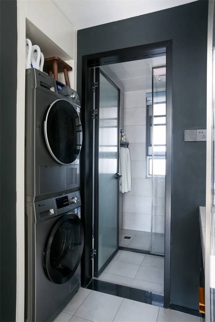 由于在陽臺處安裝了柜體,并且留出一塊區(qū)域作為狗狗的休息區(qū),因此衣物洗滌和烘干的區(qū)域移到了衛(wèi)浴間。如果陽臺沒有晾曬衣物的需要,日常使用烘干機可以作為替代。