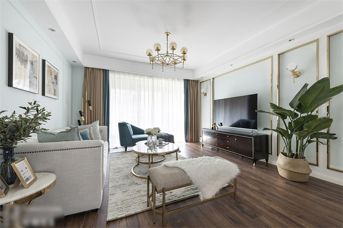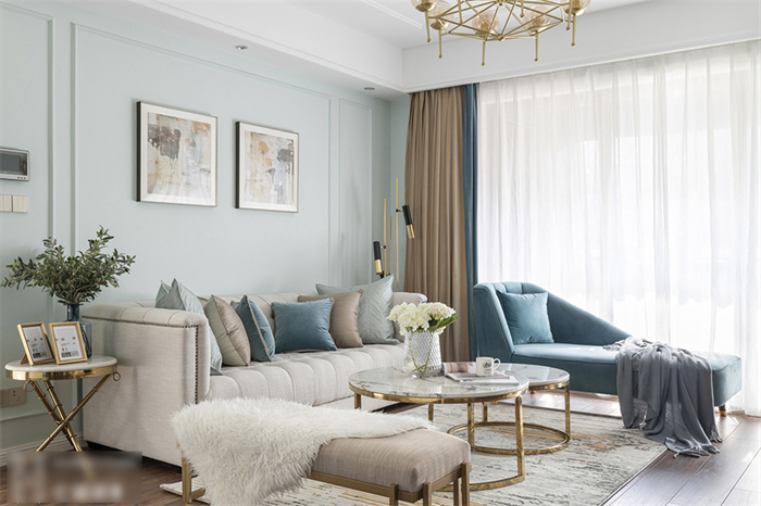 1、全屋以淺藍為主色調,輕奢金色、墨藍色做點綴,搭配精致燈具和美式軟裝,簡約中不乏浪漫精致;