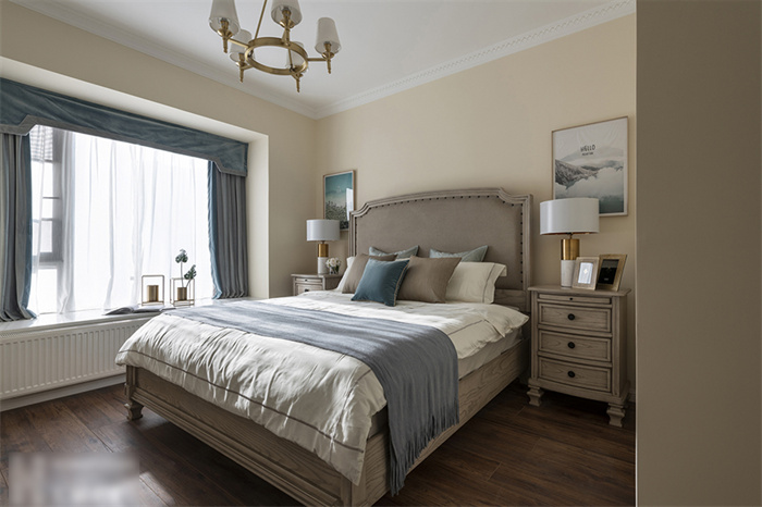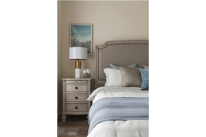 主臥選用奶油色墻面,色調清淺自然,木質地板的溫潤與清新提升了空間的暖意,冷暖搭配簡潔而優(yōu)雅。小巧的床頭柜輔以格調擺件,淡雅內斂的軟裝色系,使臥室空間氛圍安靜而溫柔。經典美式大床盡顯優(yōu)雅奢華,輔以藍調的背景裝飾掛畫以及柔軟舒適的床品,營造寧靜雅致的休息氛圍。