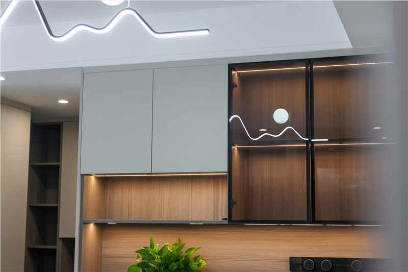 在餐廳與衛(wèi)生間的區(qū)域間以一組隔斷柜去進行空間美化,穿插的設(shè)計手法以抽屜分隔整個高柜,整體尺寸更加協(xié)調(diào),中部加入長虹玻璃的設(shè)計可以搭配綠植或是手辦擺件,整體會更精致。