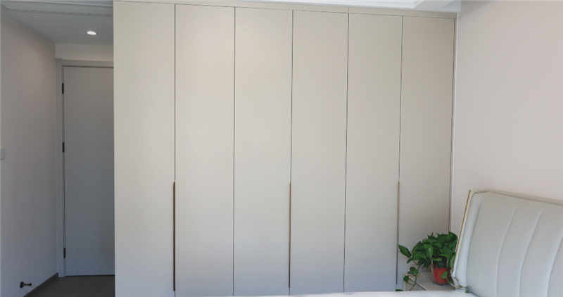 主臥室作為屋主的休息區(qū),整體更強調(diào)收納性和舒適度,采用茶白的色彩與全屋白色系更適配,一門到頂?shù)恼乓鹿癫捎玫氖且蛔中屯w拉手,方便使用。