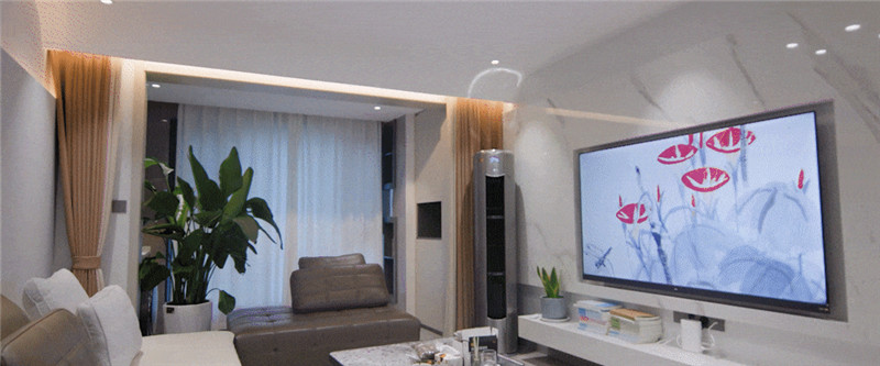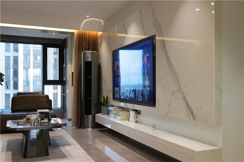 電視背景墻為大理石紋,將電視機(jī)整體嵌入,視覺(jué)延展;底柜整面抬高做懸浮設(shè)計(jì),是收納柜,頂部擺上裝飾物不在話下,這立體感也是讓人愛了。