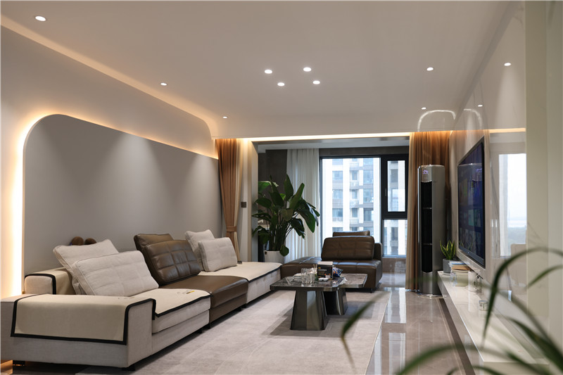 秉承現(xiàn)代簡(jiǎn)約的高定思維,以水灰及茶白為基調(diào),用圓弧線條綜合布局,輔之以燈光調(diào)和,讓整體空間自然溫柔,卻暗藏一絲恢弘之意。