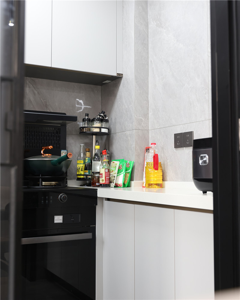 櫥柜貼墻而建,柜與電器組合收納力、實(shí)用性在線;遵循洗→切→烹→盛的動(dòng)線,提高生活便捷度;臺(tái)面巖板,耐刮、防水性能好。