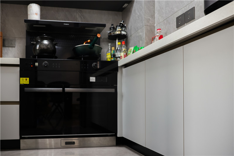 有室有食,簡(jiǎn)單幸福。堅(jiān)守功能主義的理念,以結(jié)構(gòu)為入眼點(diǎn)布局色彩、設(shè)計(jì),使得動(dòng)線明晰;蘭迪灰門板與黑色調(diào)的中和,簡(jiǎn)約又不失大氣感。