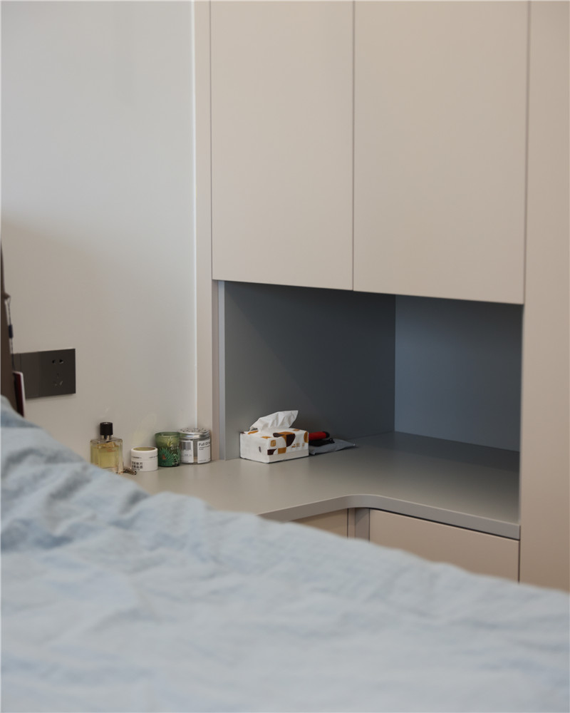 主臥采用無(wú)主燈設(shè)計(jì),內(nèi)嵌燈光與射燈營(yíng)造空間氛圍感;靠窗邊做了一個(gè)嵌入柜,不占地方還分散了室內(nèi)的存儲(chǔ)壓力。