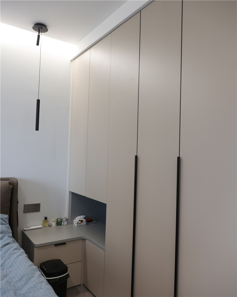 次臥做了一組到頂衣柜,茶白色門板好看好搭;為了節(jié)省空間,設(shè)計(jì)師從柜體中延伸做床頭柜,頗具特色;整體布局簡(jiǎn)約大氣,協(xié)調(diào)整體氛圍。