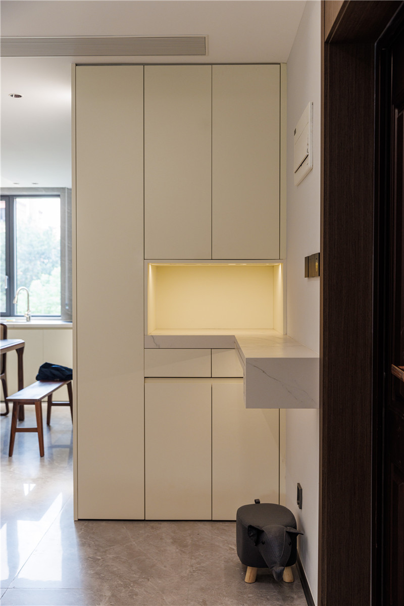 在玄關(guān)為了提升空間利用率,我們采用了嵌入式的柜體進(jìn)行上下分區(qū)收納。中部掏空后延伸大理石臺(tái)面作為置物臺(tái),放置一些小物品都很實(shí)用。