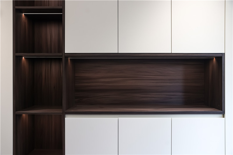 圍合式的空間布局里,電視柜成為環(huán)境的主角,以納科榆木打底,再以芬蘭白柜體進(jìn)行生活收納。