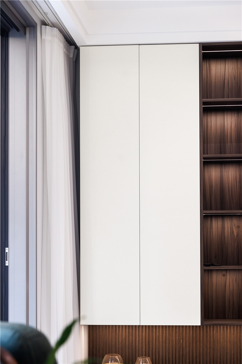 餐邊柜收起生活的繁雜,還原高端定制的有序與雅致。設(shè)計(jì)師延伸柜體轉(zhuǎn)角后在地柜上留了一個(gè)西廚的操作臺(tái),中西廚結(jié)合,包容每一位家人的飲食習(xí)慣,讓用餐與烹飪自成一體,傾情享受他們的“食光”。