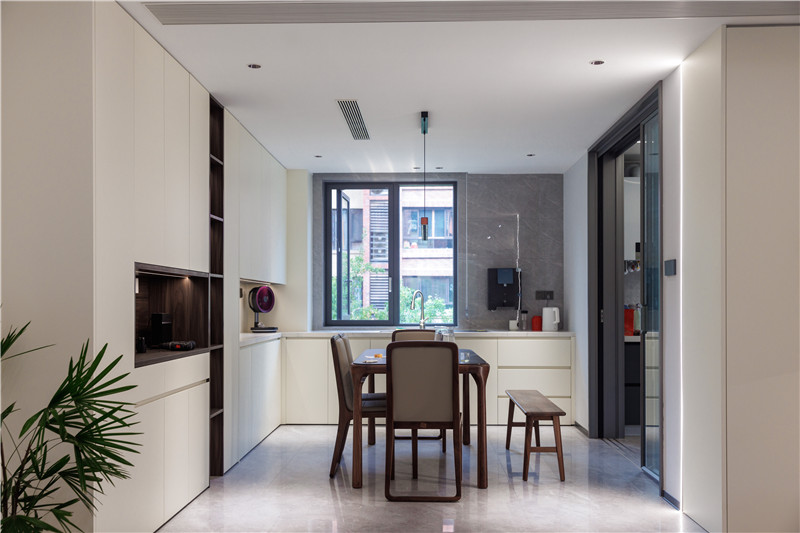 餐廚空間的設(shè)計(jì)風(fēng)格與起居空間保持一致,除了傳統(tǒng)的U型封閉式中廚外,在用餐區(qū)還做了高定全屋圍合的設(shè)計(jì)。