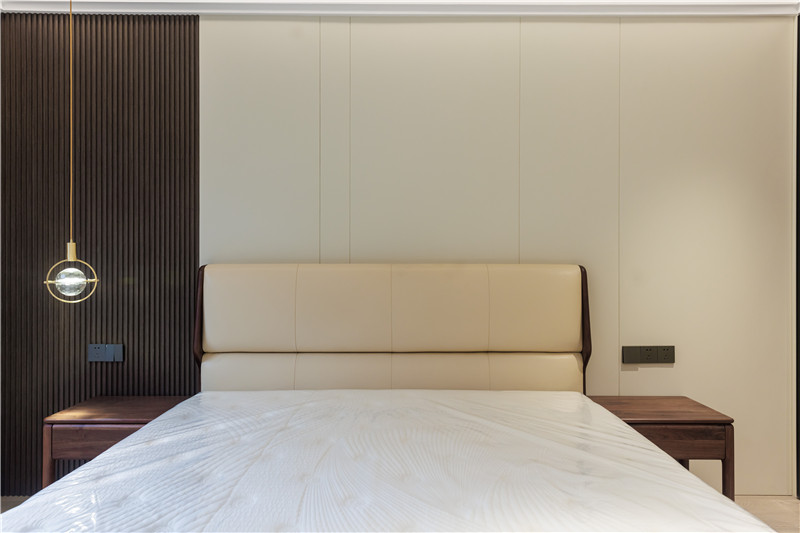 主臥的床頭背景也頗有意蘊(yùn),將拉槽墻板與格柵墻板進(jìn)行拼接,增加層次感和設(shè)計(jì)感,白棕配色高級(jí)又內(nèi)斂,是追逐質(zhì)樸生活的文雅格調(diào)。