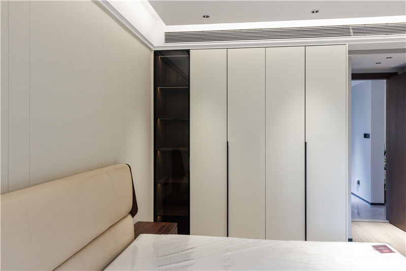 主臥空間延續(xù)一貫簡(jiǎn)約的設(shè)計(jì)手法,注重提升家居質(zhì)感,強(qiáng)調(diào)人文的居住感受。自客廳格柵背景墻延伸至臥室空間,做成一體化的門套門框及門扇。